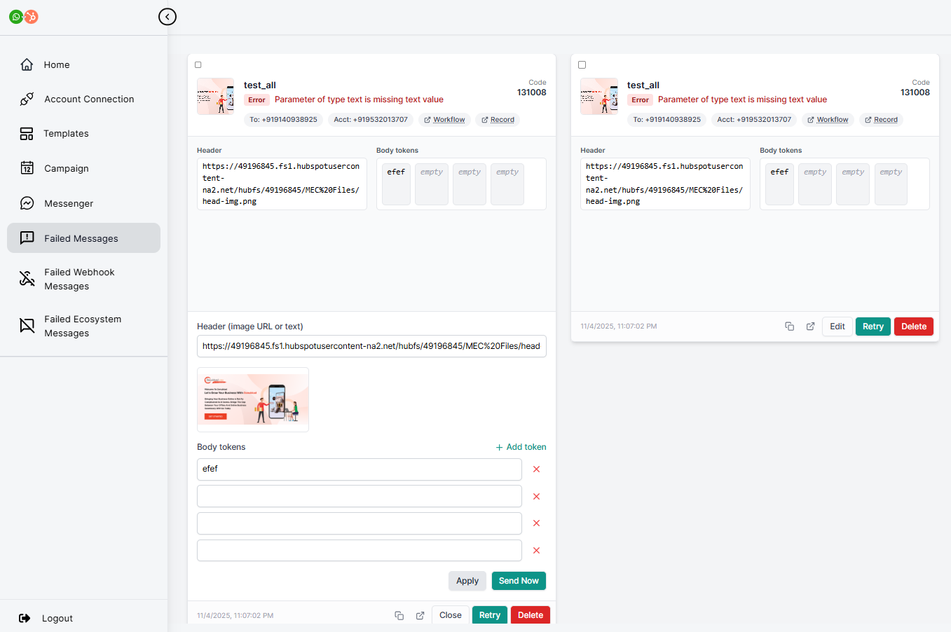 When the message delivery encounters an error on the webhook provider’s system (HubSpot), due to server errors, timeouts, network issues, or an invalid URL/configuration. Then, the failed messages will appear in this tab.