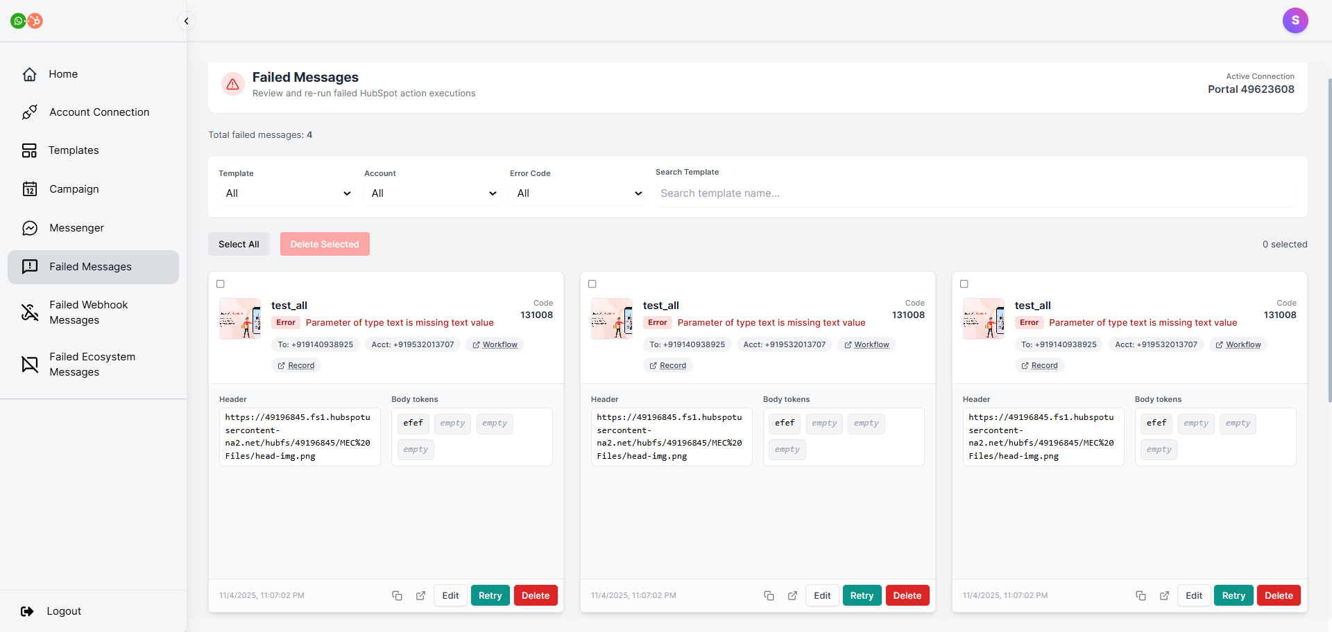 Here you can find the failed messages log that occurred at the HubSpot Webhook level.