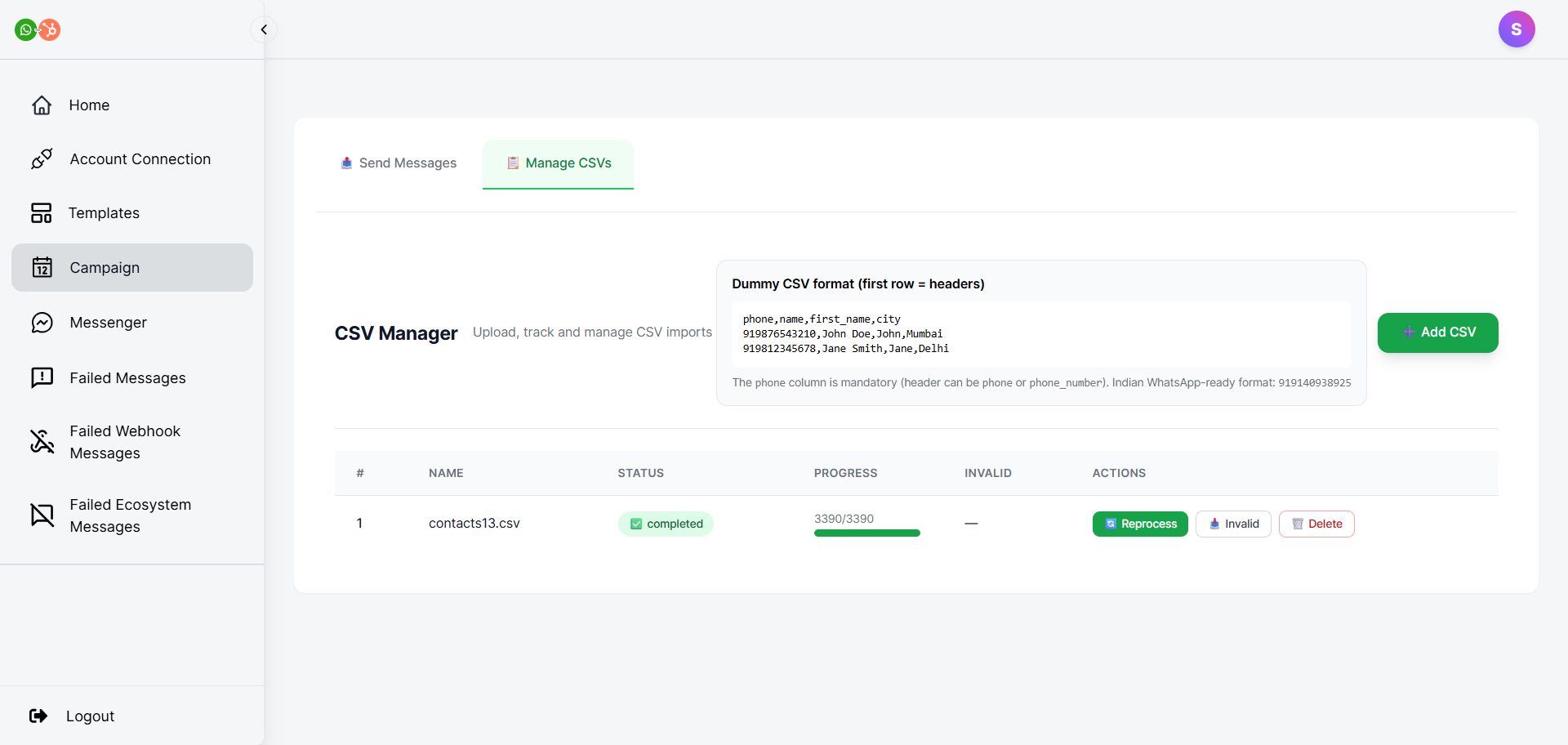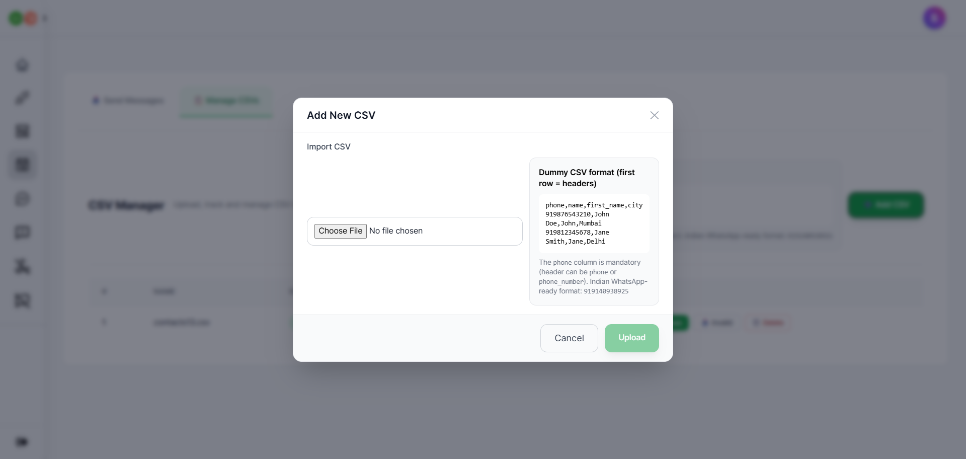 • Once done, click Upload. And you will be able to view your uploaded CSV file in the Manage CSVs tab.