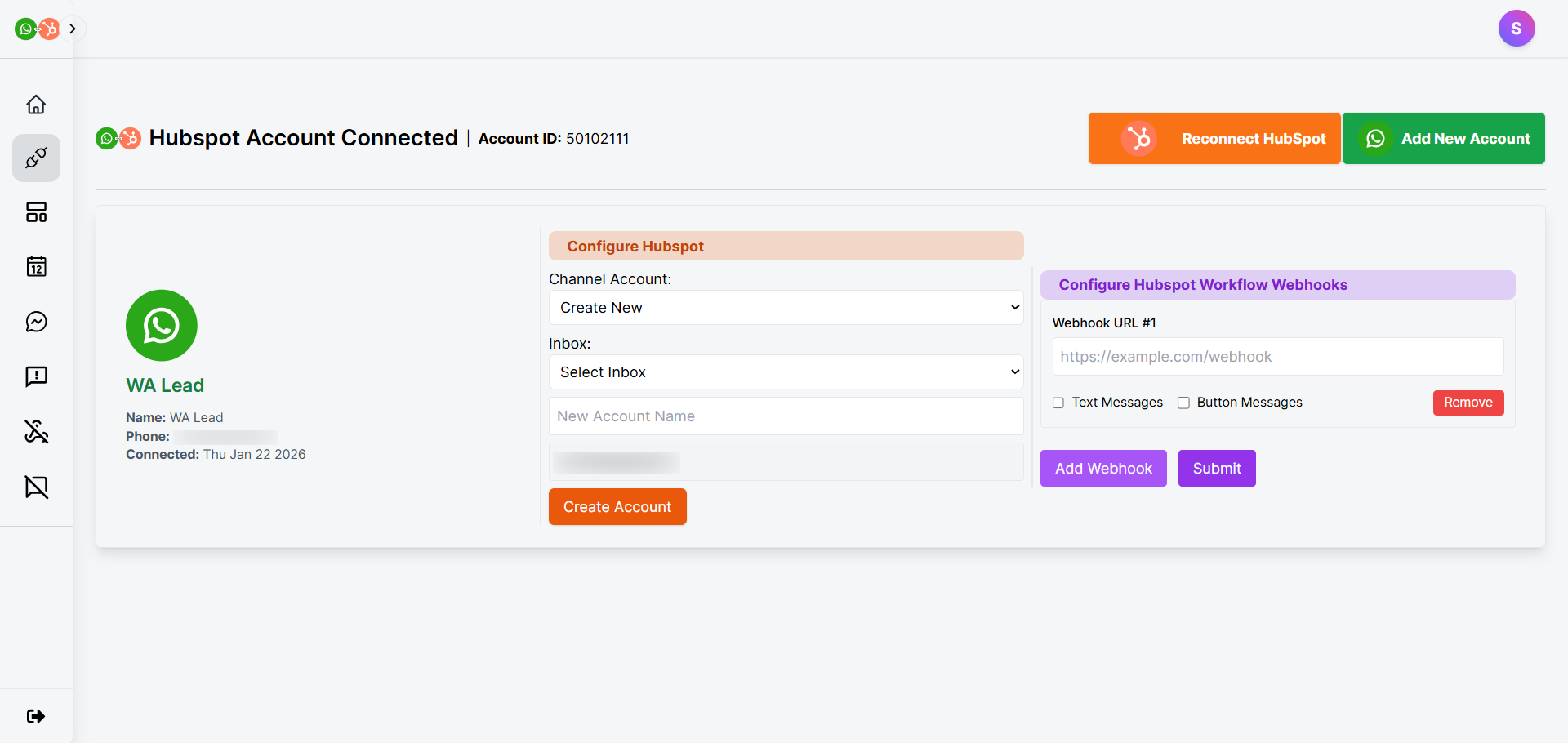 Once the HubSpot is connected, you will be able to see the ‘Add New Account’ button on the top-right.