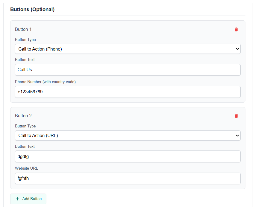 • Phone Call: Enter button text and provide a Number with country code.