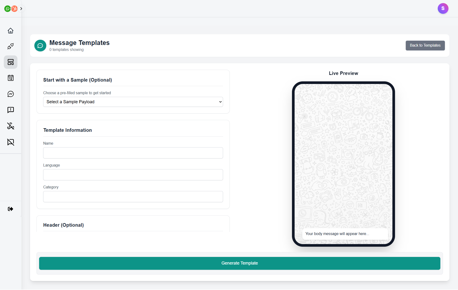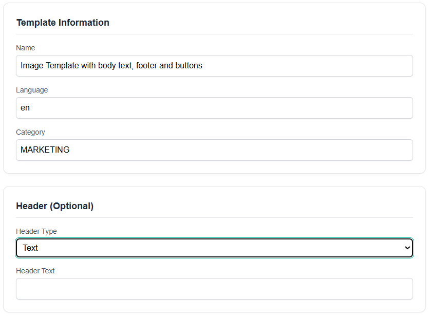 • Next, enter the Template Information, i.e., Name, Language, & Category. Moreover, you can choose to have ‘no header’ or keep a header as text or an image, even if you have chosen a different payload. The content of the header for ‘text’ can be inserted here only. But if you select image as header, then you can upload the image when you frame the message for a campaign, automation, or 1:1 messaging, later on.