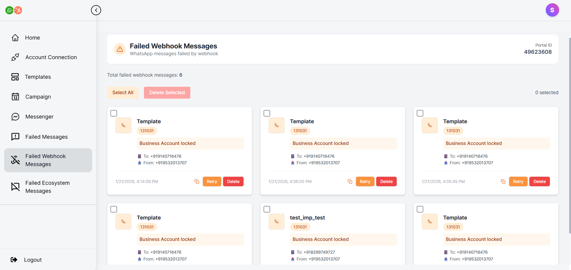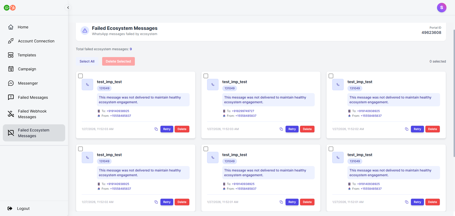 WhatsApp Connect automatically retries these messages where possible. From this section, you can review failed sends, retry them manually, or delete them if they are no longer required.