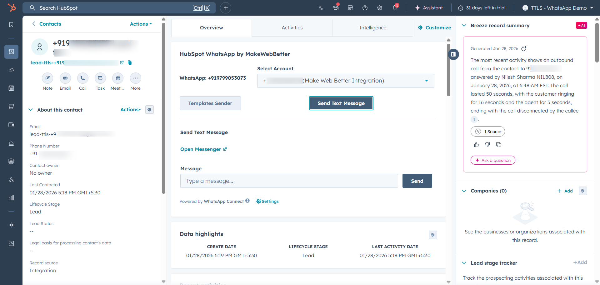 WhatsApp Connect by MakeWebBetter primarily enables HubSpot WhatsApp integration and also facilitates a messaging layer.   The HubSpot WhatsApp integration further allows you to manage conversations with your contacts, send one-to-one messages, and broadcast to segment-specific groups within the app or HubSpot.   Moreover, this app aims to give you full visibility and control over your WhatsApp message sends, with an auto-retry mechanism and a dedicated space for failed messages to manage & retry manually.