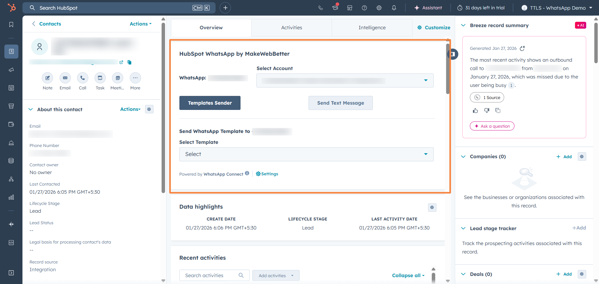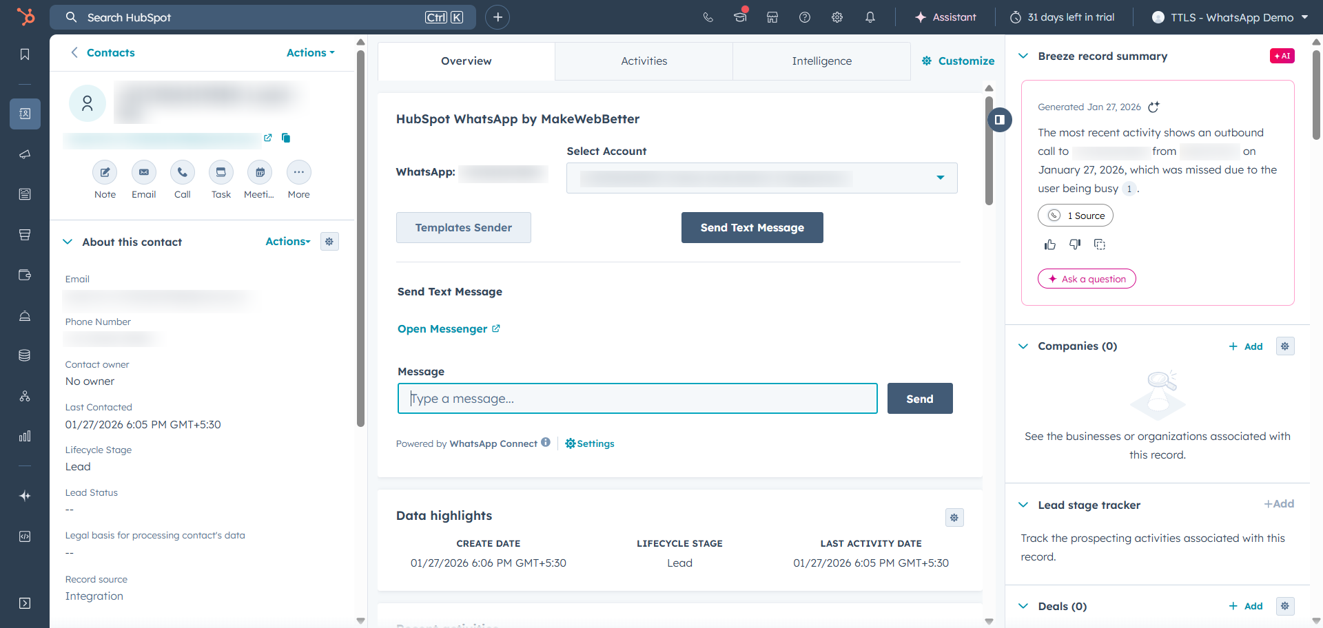 After connecting your WhatsApp account and your HubSpot account, you will be able to access the free version of WhatsApp Connect functionalities. (Upgrade to a paid plan to unlock full access.)