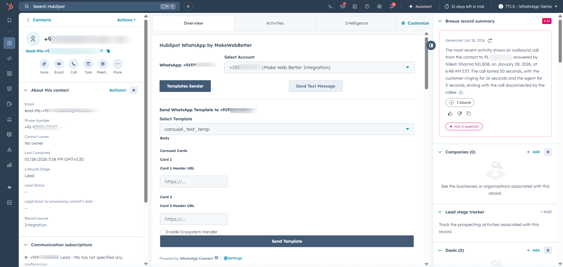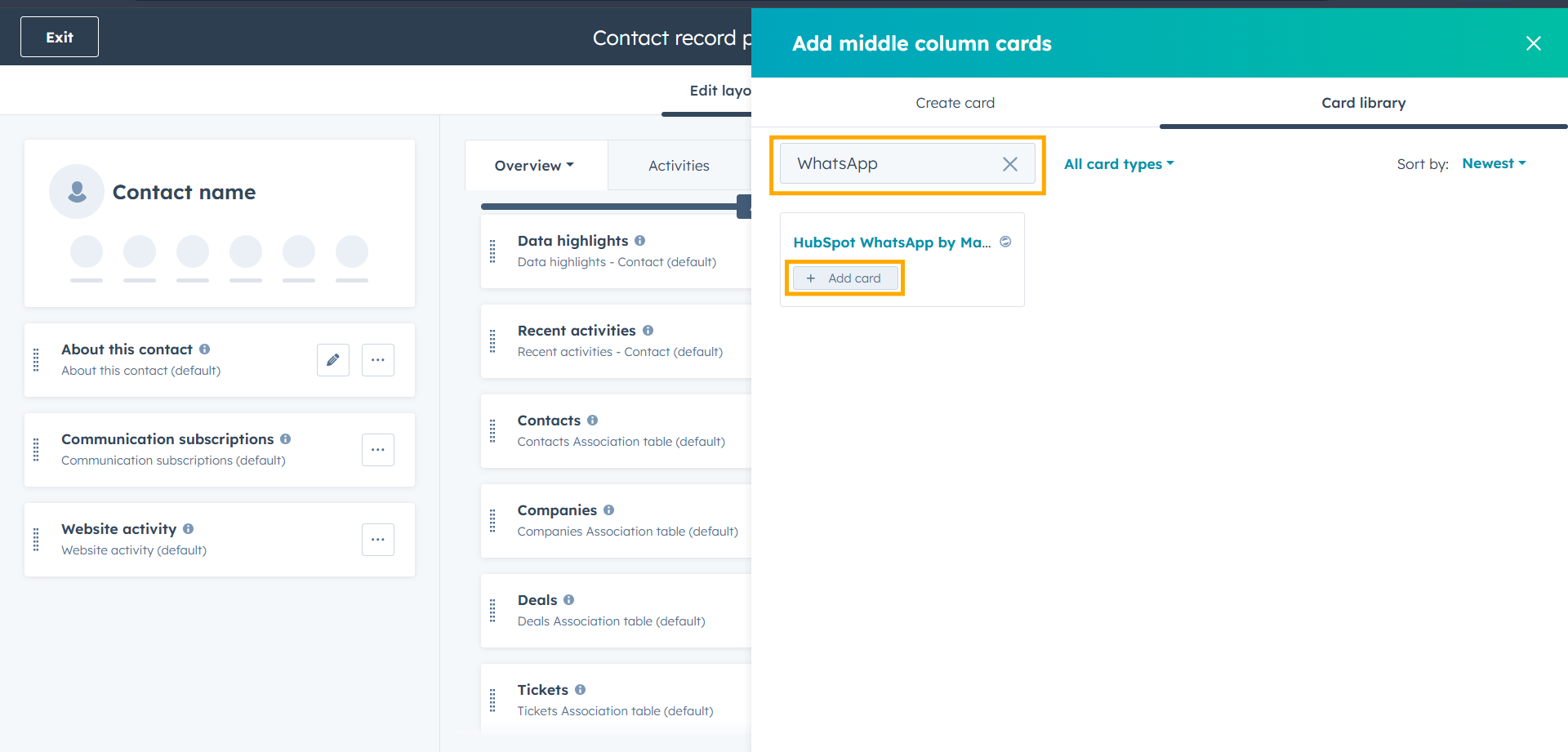 • Next, click + Add Card button under “HubSpot WhatsApp by MakeWebBetter”.