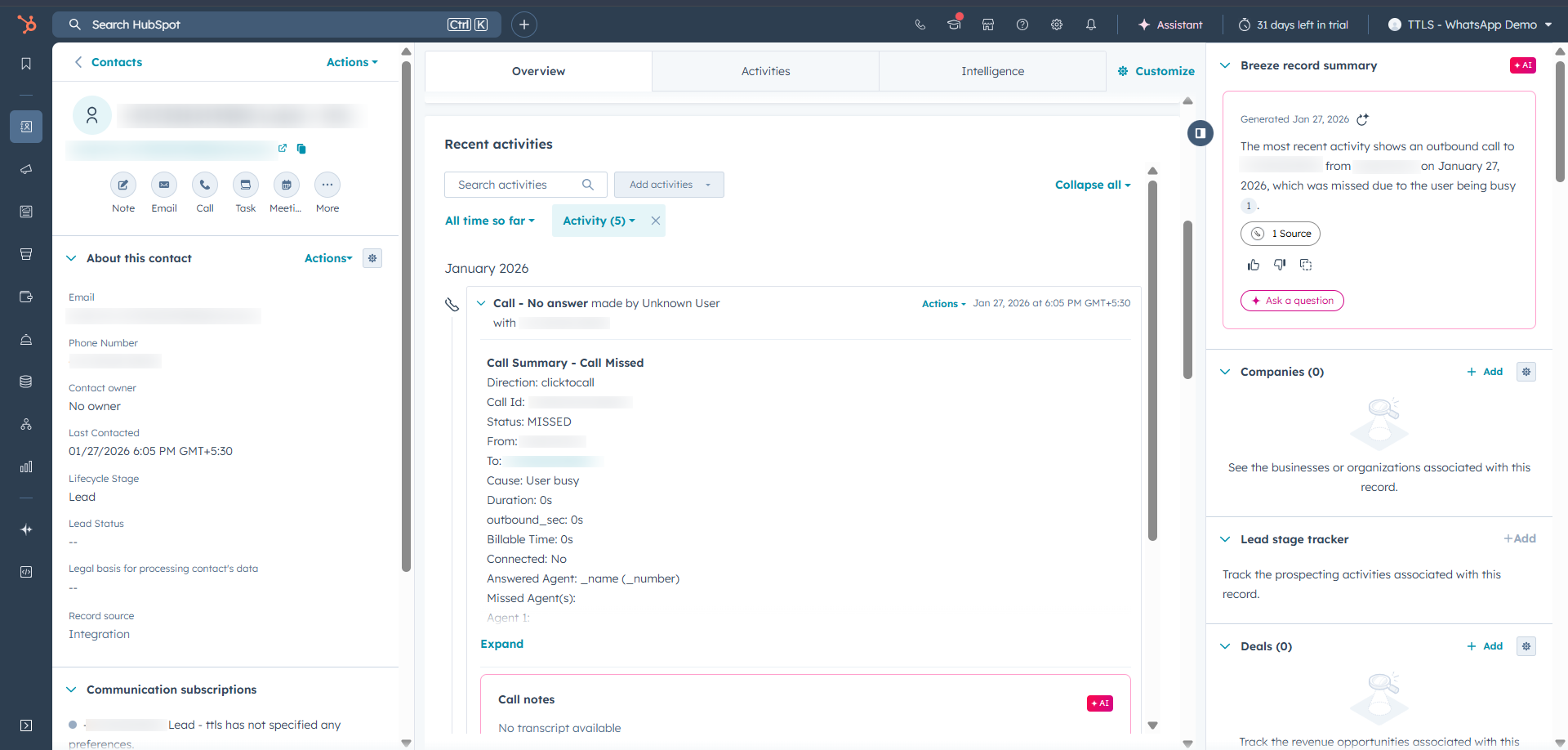 • By following this setup, you’ll be able to access the WhatsApp Connect App Card in the Timeline Events Overview section of your contacts.