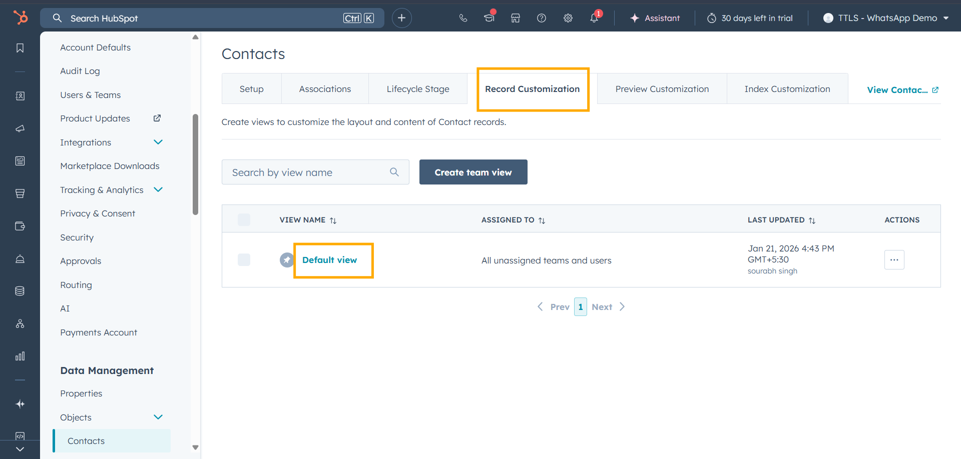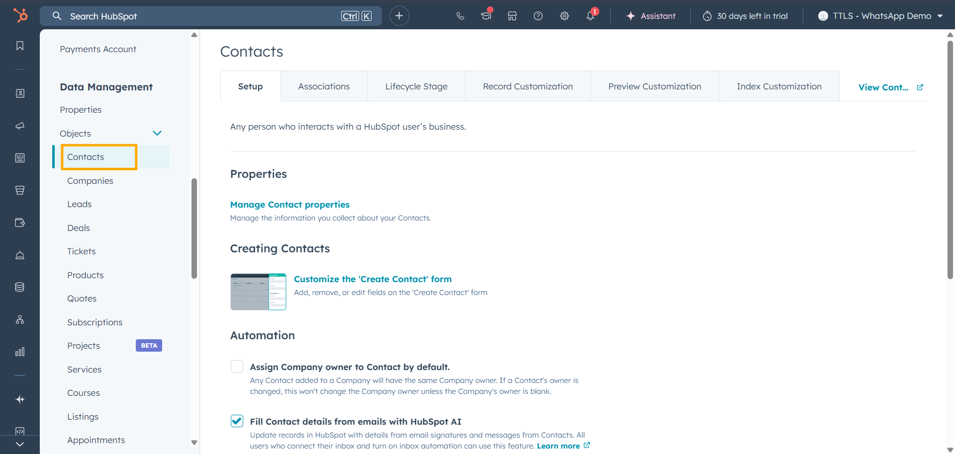 • Then, click on the Record Customization tab in Contacts.