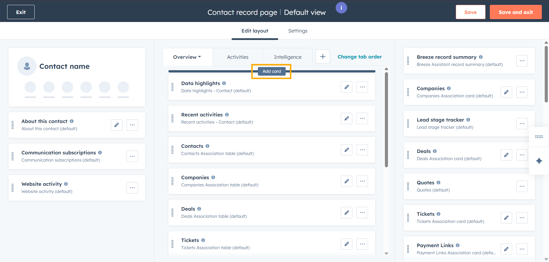 • To add the WhatsApp Connect app card in the Contact Event Overview tabs, simply hover above the top tab and then click Add Card.