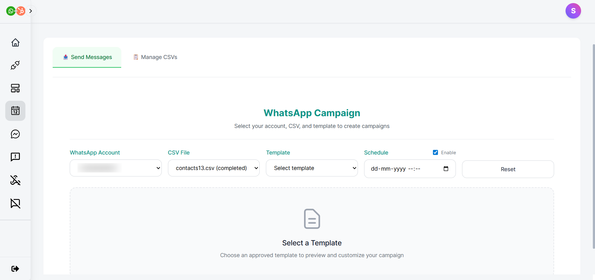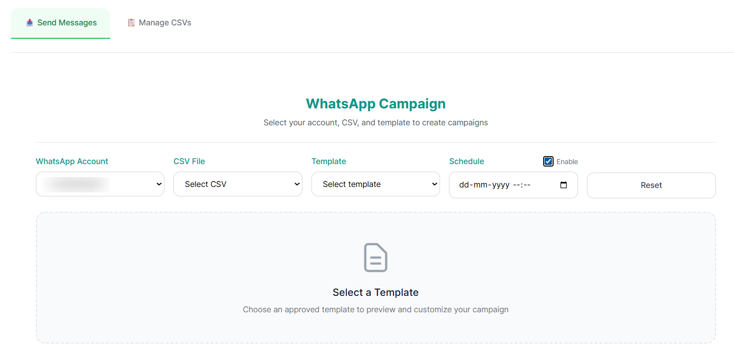 • Choose a CSV file to list the contacts that want to be included in the WhatsApp campaign. (You can upload your CSV file from the Manage CSVs tab.)