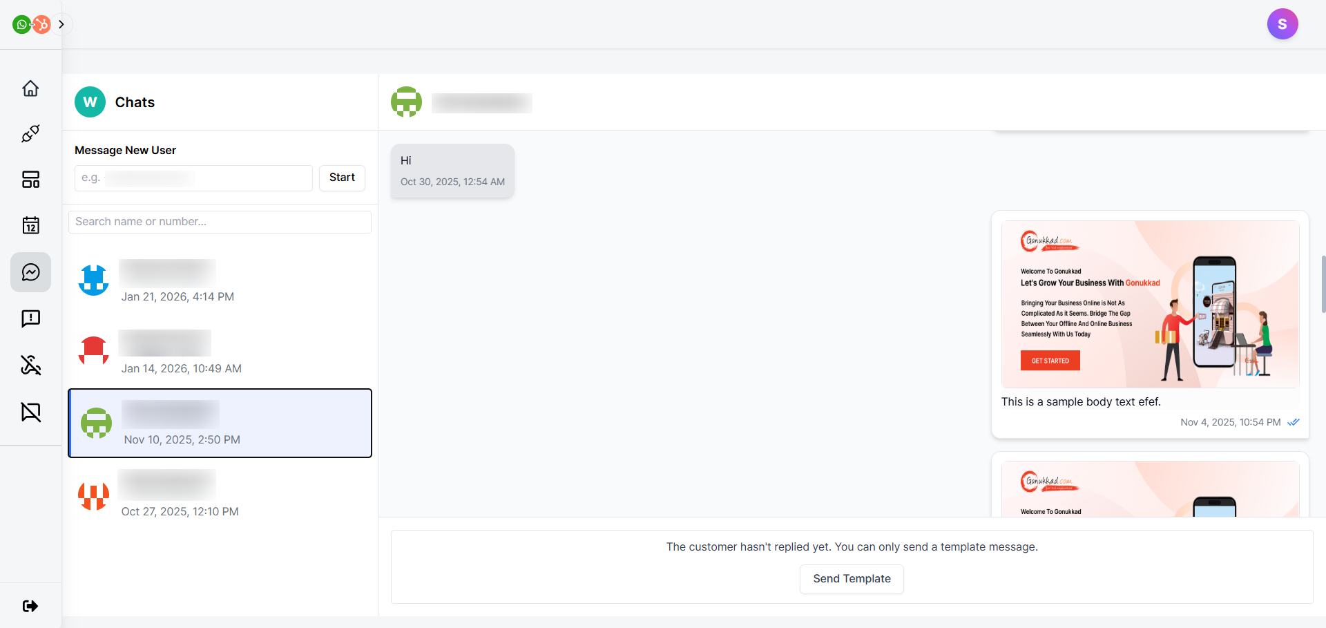 For new 1:1 conversations, click on the search box under ‘Message New User’, type in the WhatsApp number of your new contact, and then click the Start button. To send messages in existing conversations, use the templates.