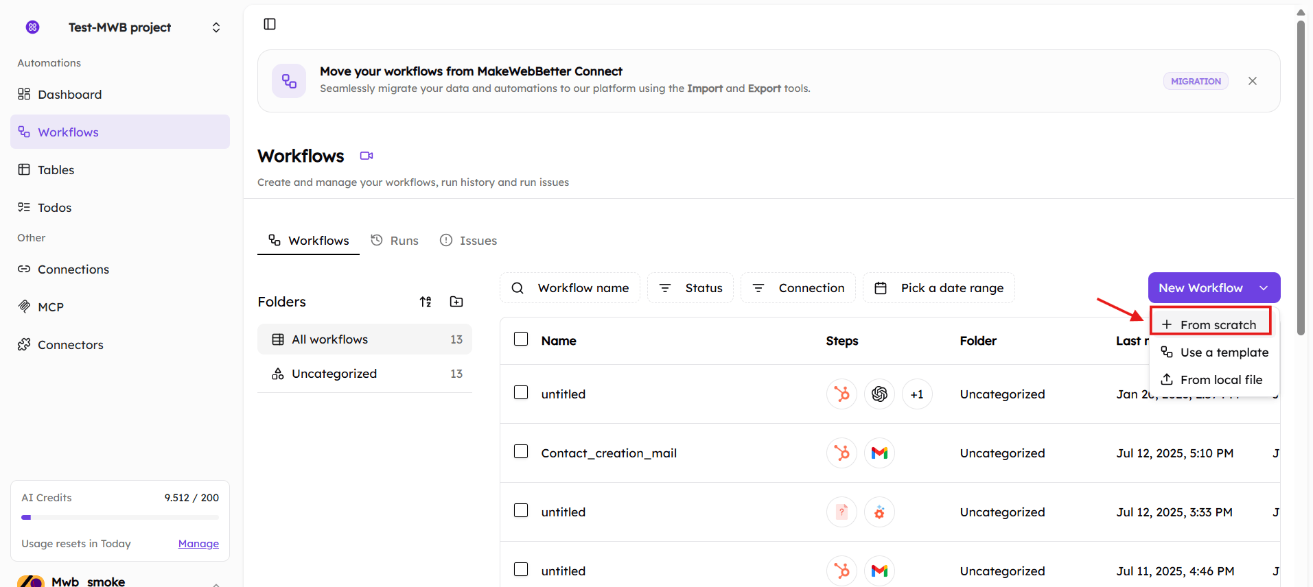To build a new workflow from scratch in MakeWebBetter Connect, you’ll have to click on the ‘New Workflow’ dropdown on the right again and choose the ‘From Scratch’ option.