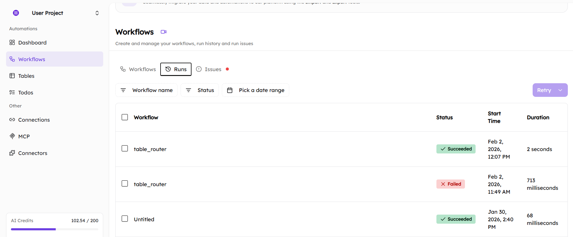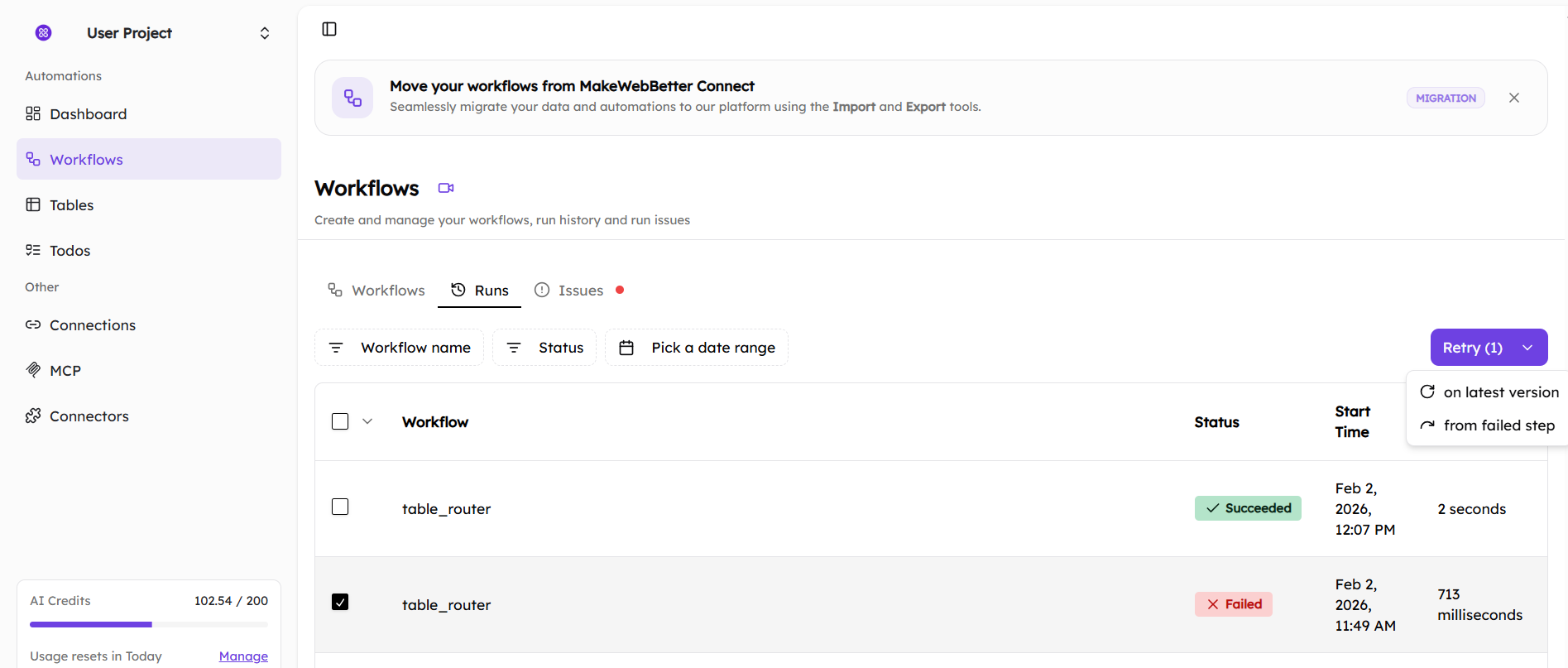 From here, you can see the status of your workflows and ‘Retry’ runs on your failed workflows by selecting a workflow and clicking on the ‘Retry’ dropdown on the right.