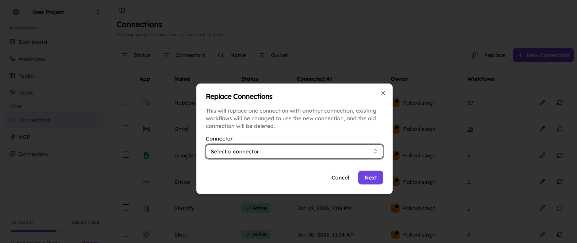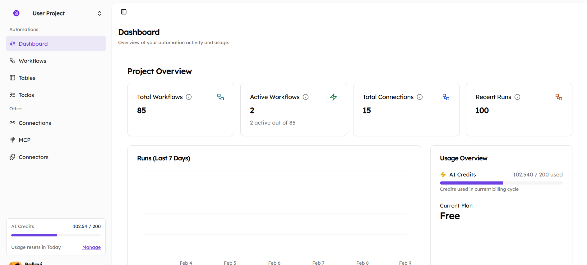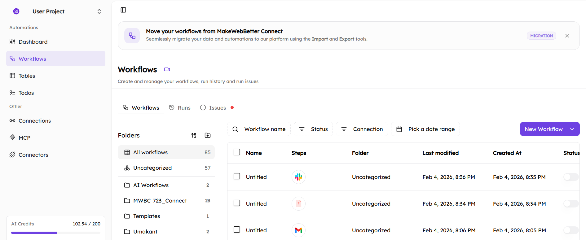 The Dashboard in MakeWebBetter Connect provides a quick overview of your project’s automation activity and usage. It helps you understand what’s running, how your workflows are performing, and how your resources are being used, all from one place.