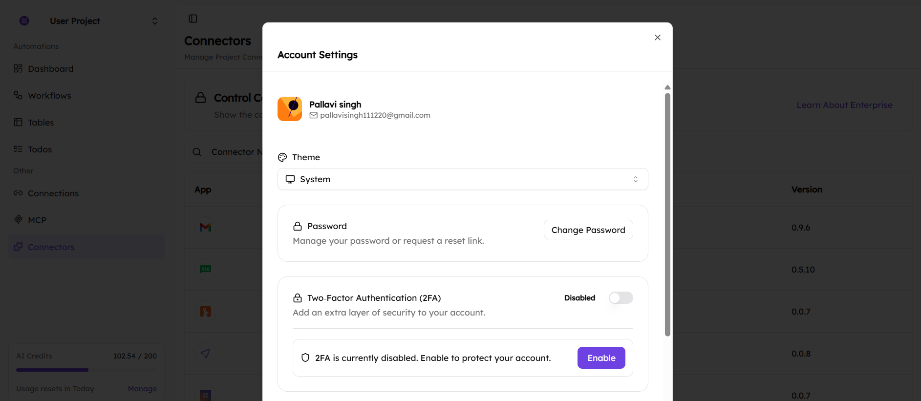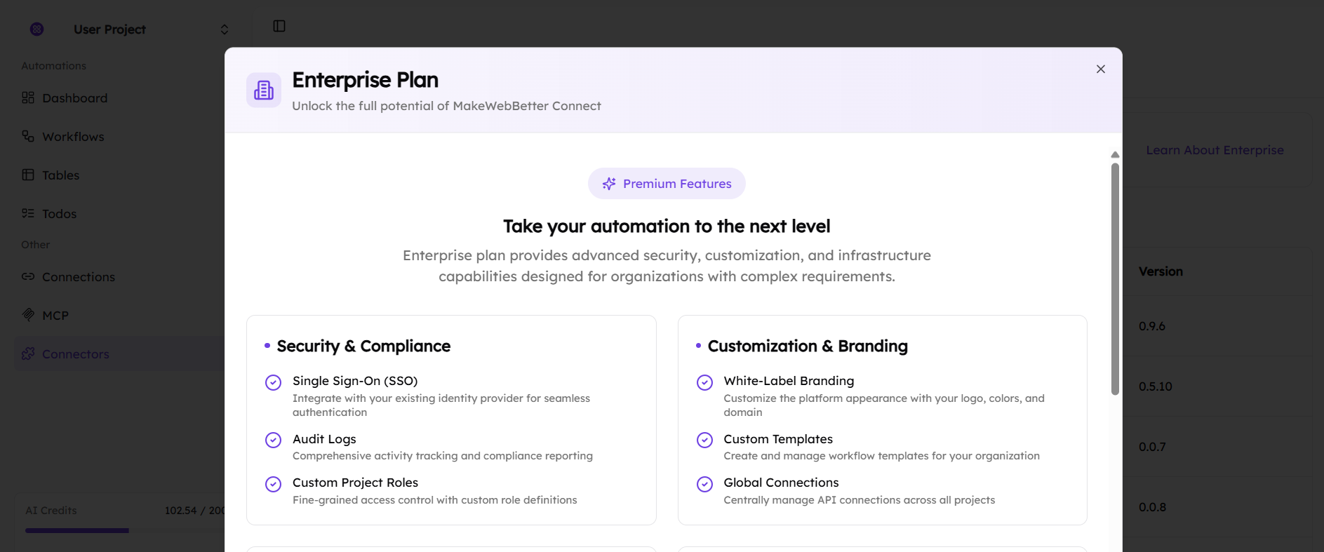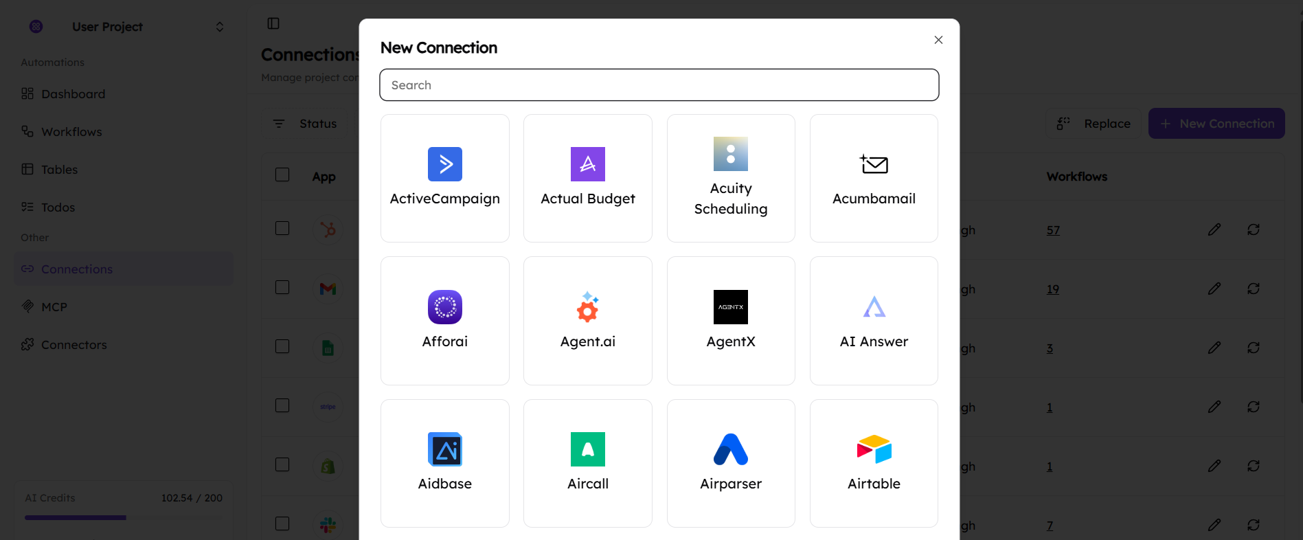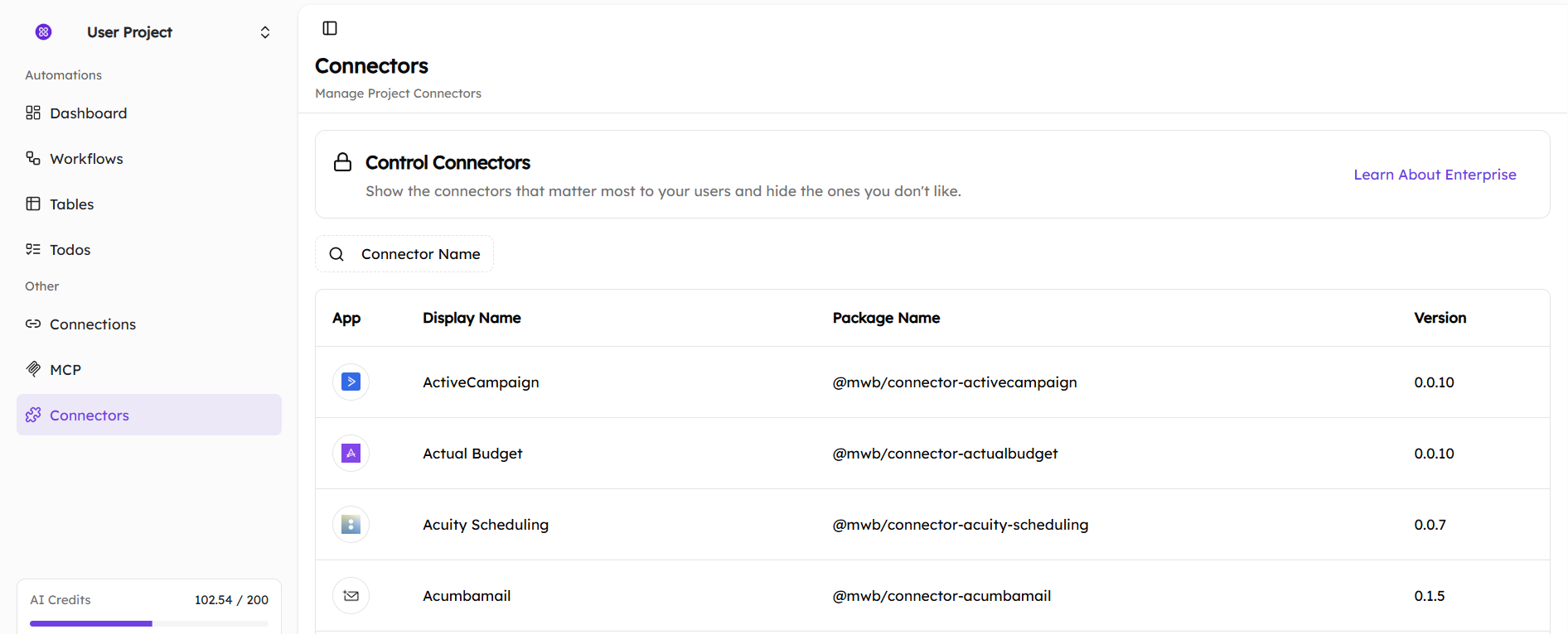 The Connectors section in MakeWebBetter Connect lets you manage all available app connectors for your project. Connectors define which applications can be used in workflows, connections, and MCP-powered actions.