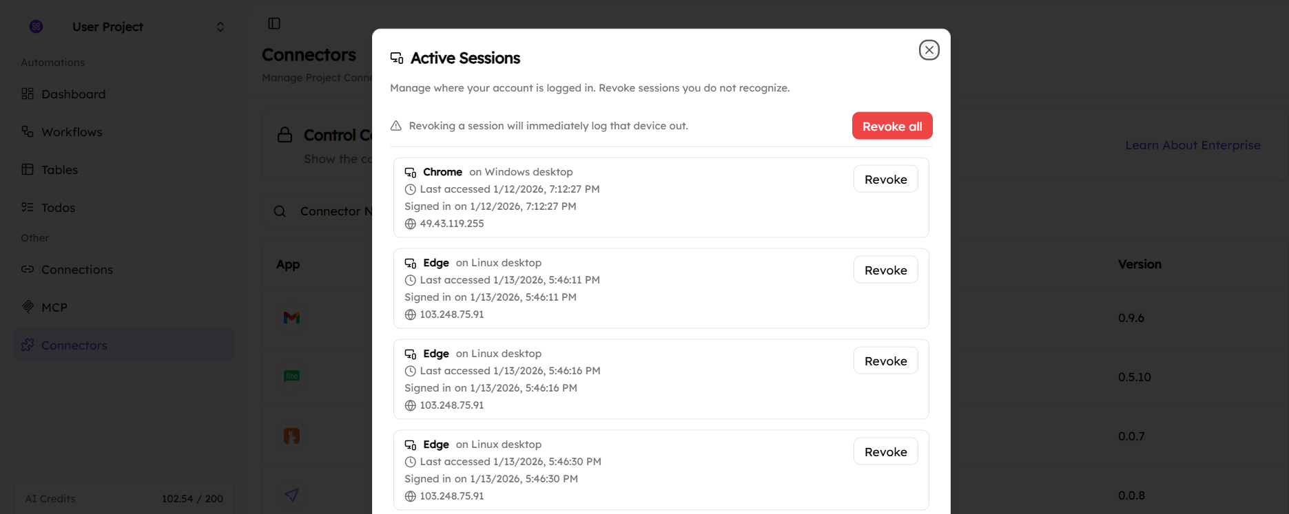 Revoking a session immediately ends access from that device, helping keep your account secure. The Active Sessions section gives you full visibility and control over where your account is being used.