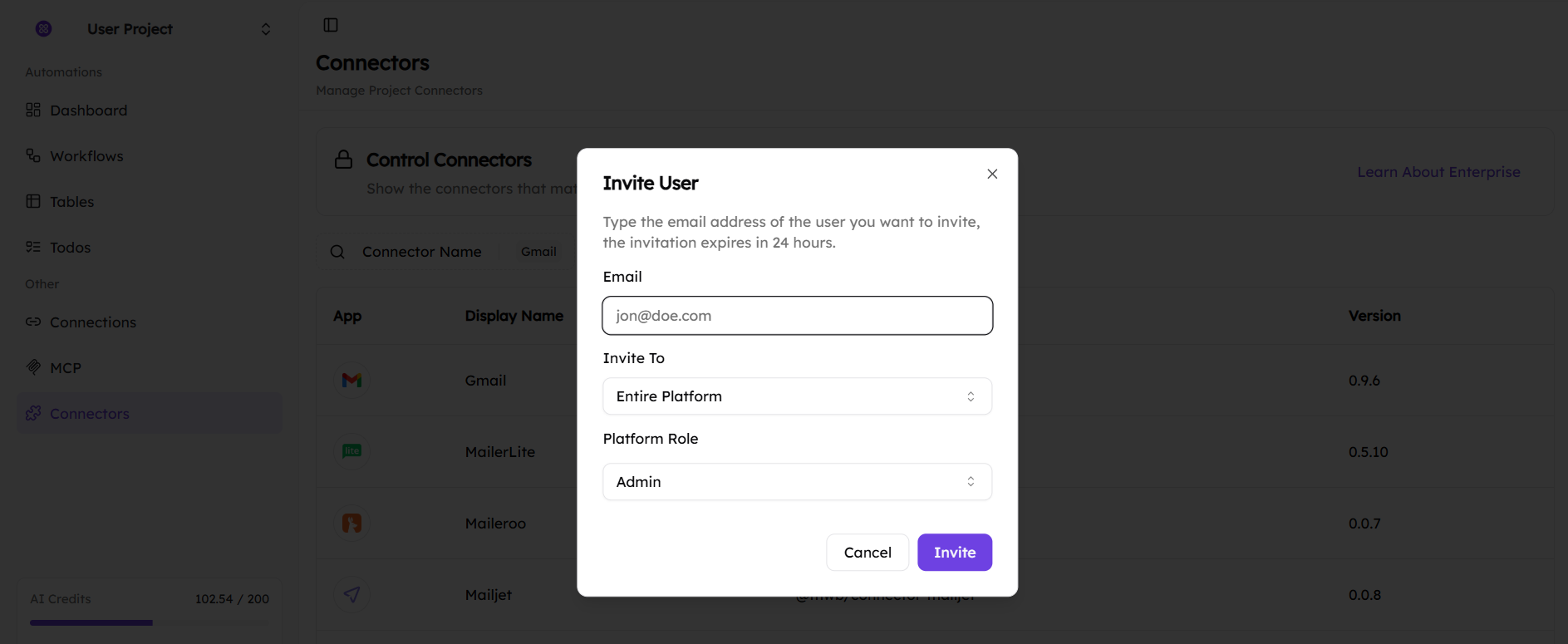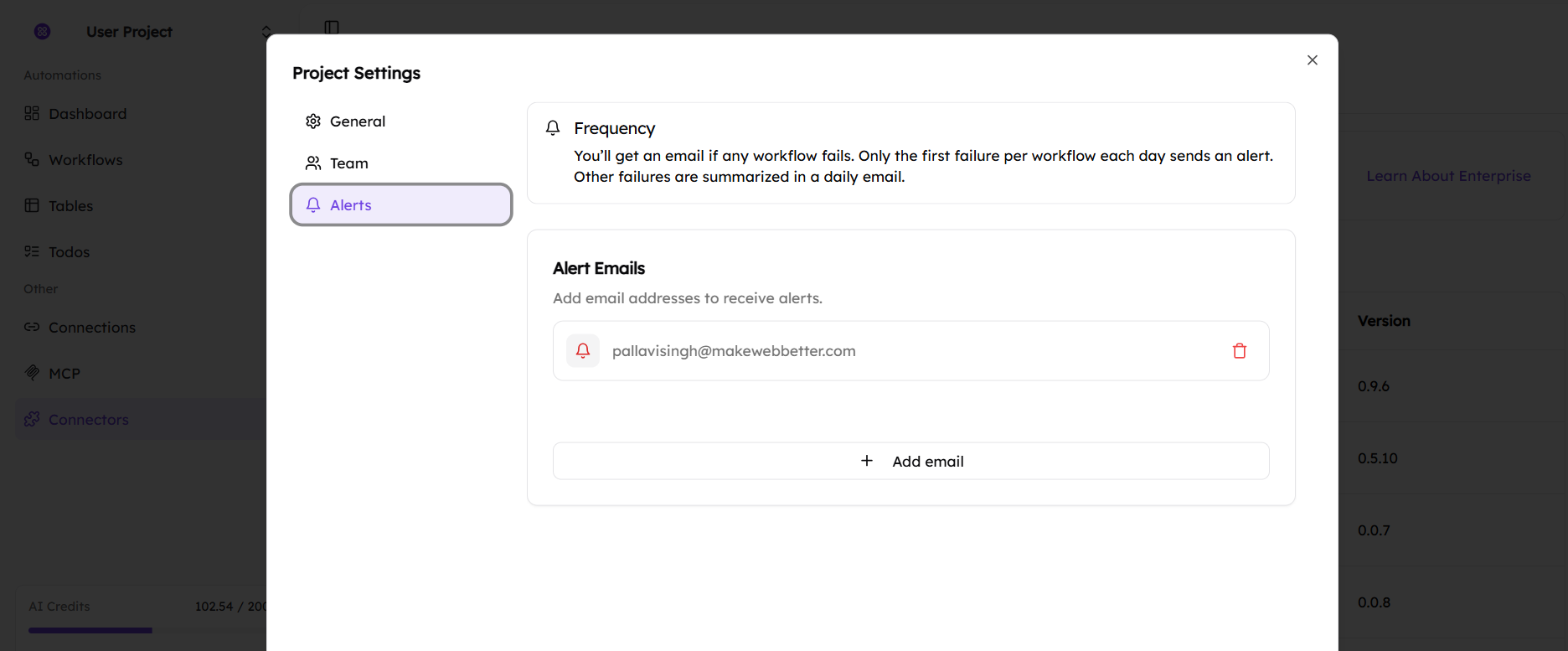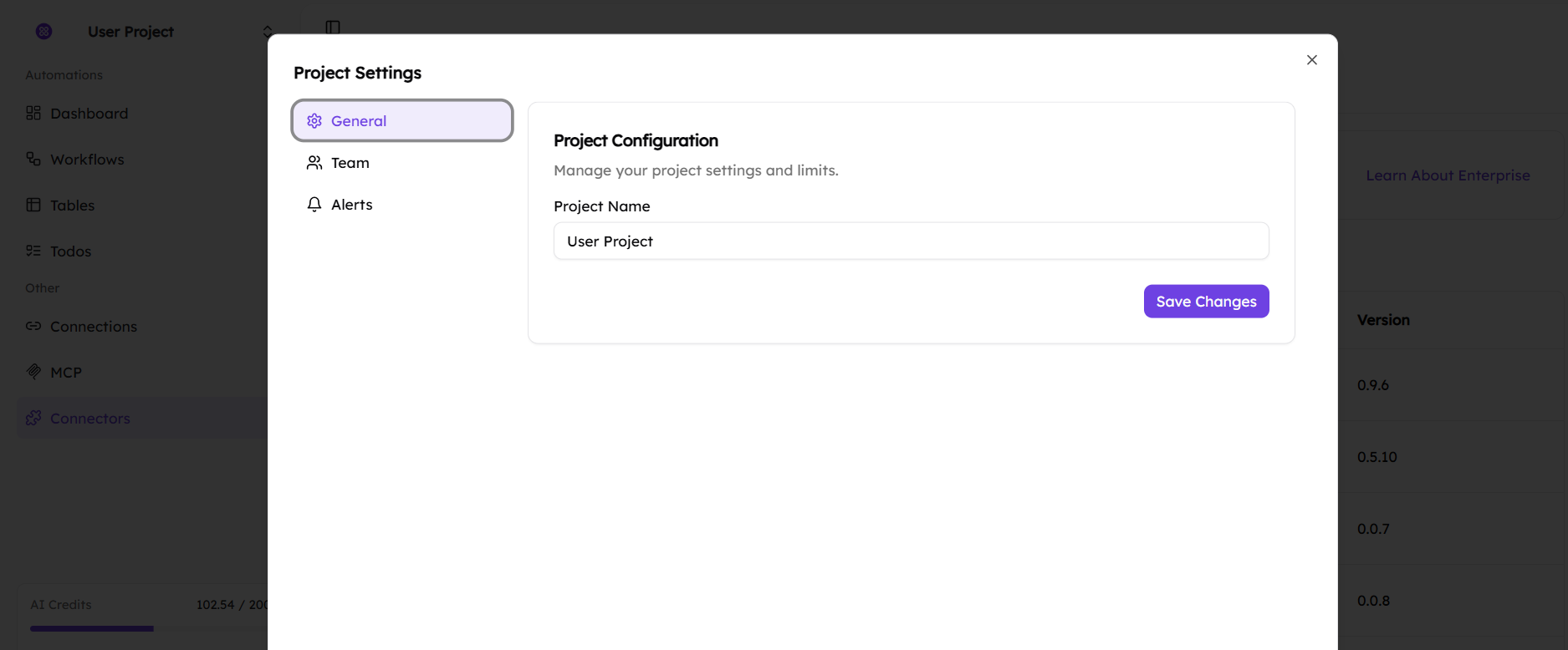 The Team tab helps ensure the right people have access to collaborate on workflows and automations within the project.