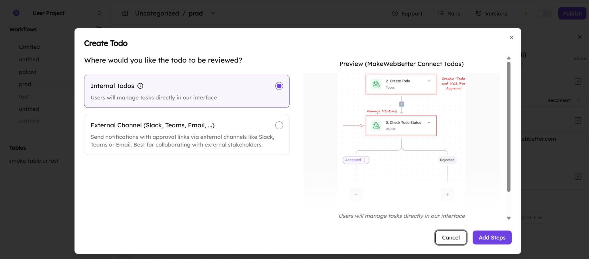 If you do not want to import an existing workflow file, MakeWebBetter Connect gives you the option to create a new workflow. This can be done via two methods:
