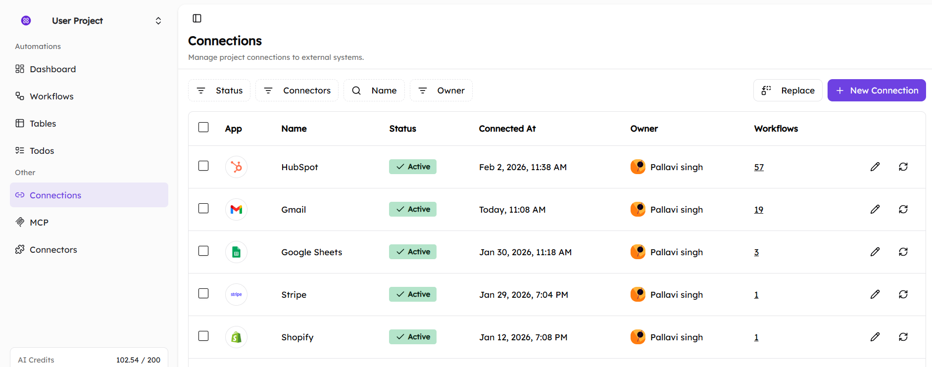 - MCP-Powered Action Layer: Expose workflows as AI-callable actions, enabling AI-assisted execution of approved automations across connected systems.