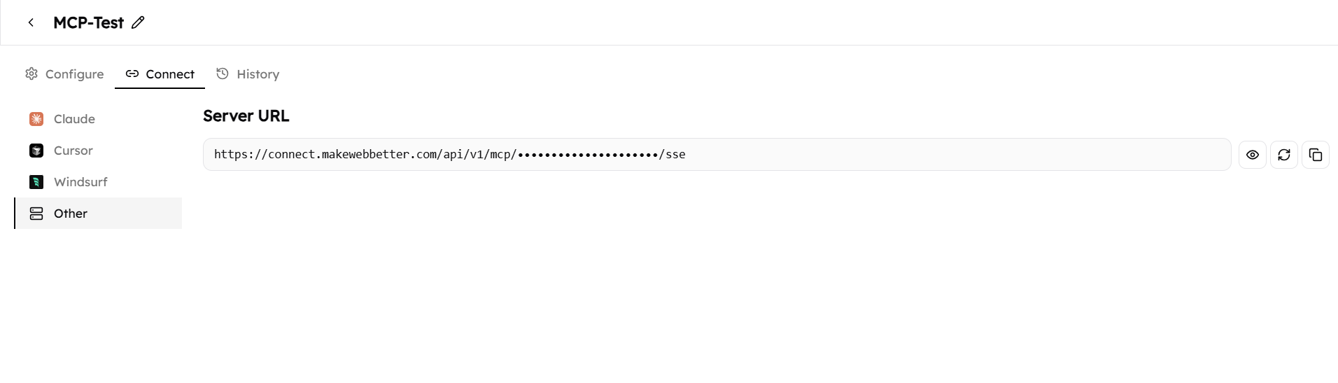 If you want to connect your MCP Server to an AI tool other than Claude, Cursor, or Windsurf, you can do so using the Server URL provided in the Connect tab.