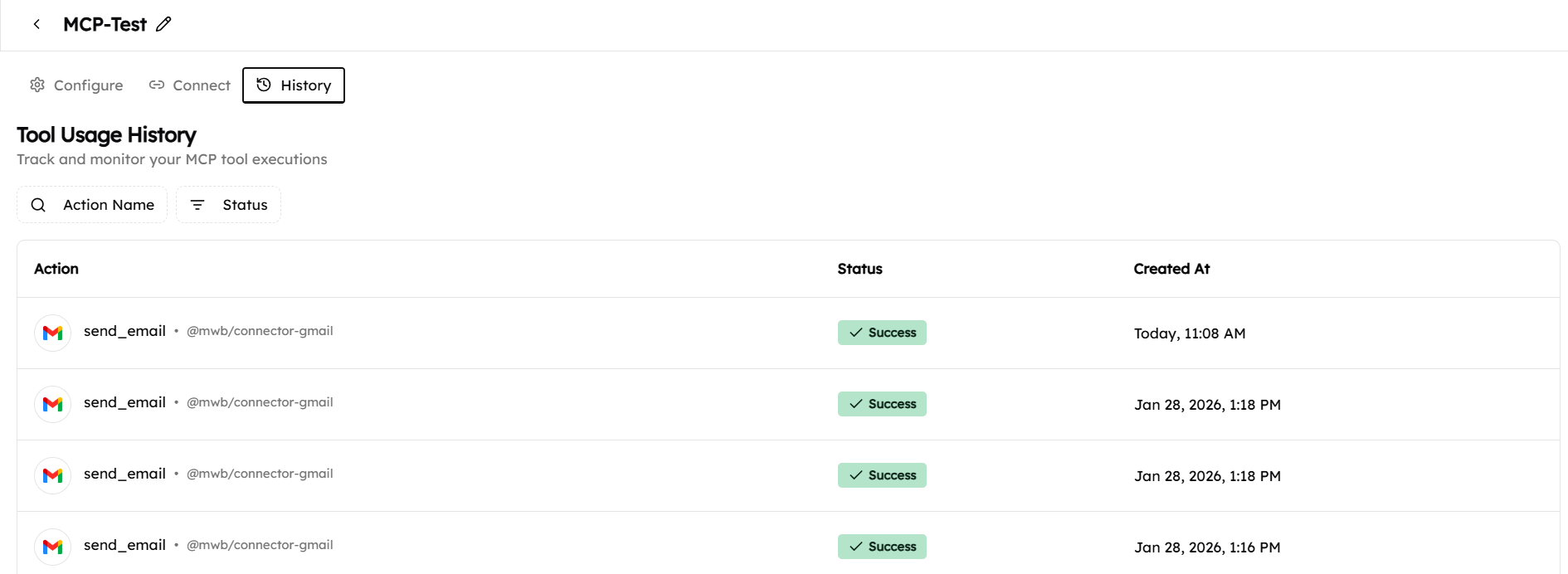 The History tab shows a record of all actions run through the MCP Server. It helps you see what actions were triggered, when they ran, and whether they were successful. It allows administrators to review, troubleshoot, and validate how AI is interacting with connected systems.